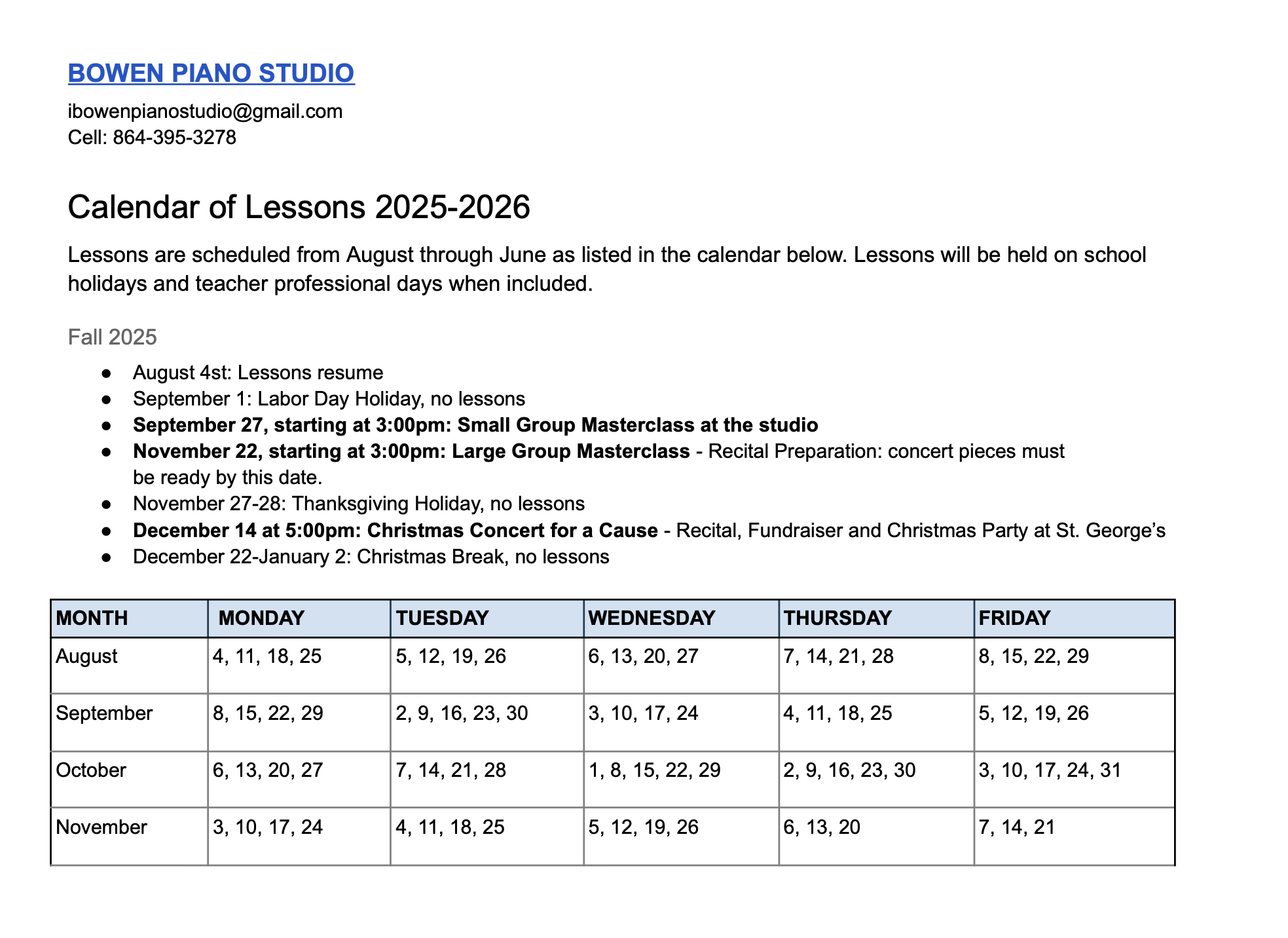 Tuition for the 44 lessons is prorated into 11 equal monthly payments due the 1st lesson of the month, August through June.